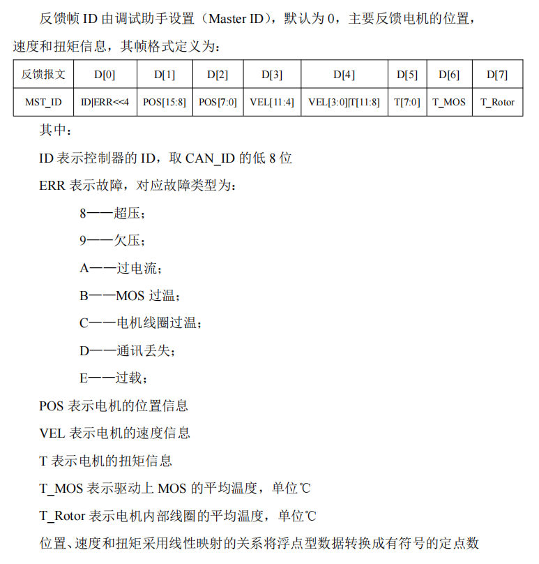 Data[1], Data[2]:POS,位置,电机此时角度(rad),和控制帧中的位置对应,占2字节,