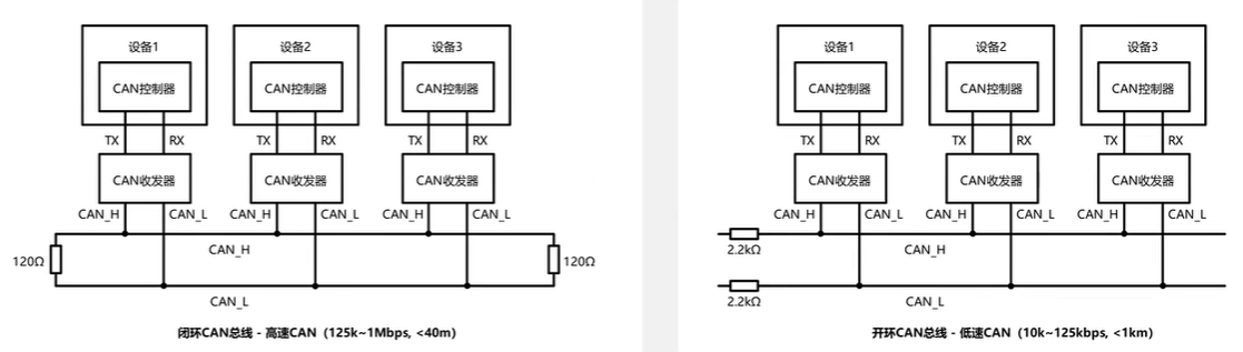 在低速CAN中,由于长距离线路中会有损耗,因此总线需要拉高电平,这样,默认的两根差分信号线电平不再相同,因此不能像高速CAN一样相连,此外高速,之所以高速,其闭环的连接方式,也能让差分信号更快地归零,从而实现高速
