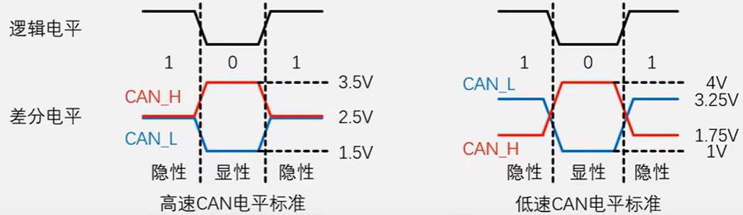 低速CAN:电压差为-1.5V → 逻辑1(隐性电平)、电压差为3V → 逻辑0(显性电平);